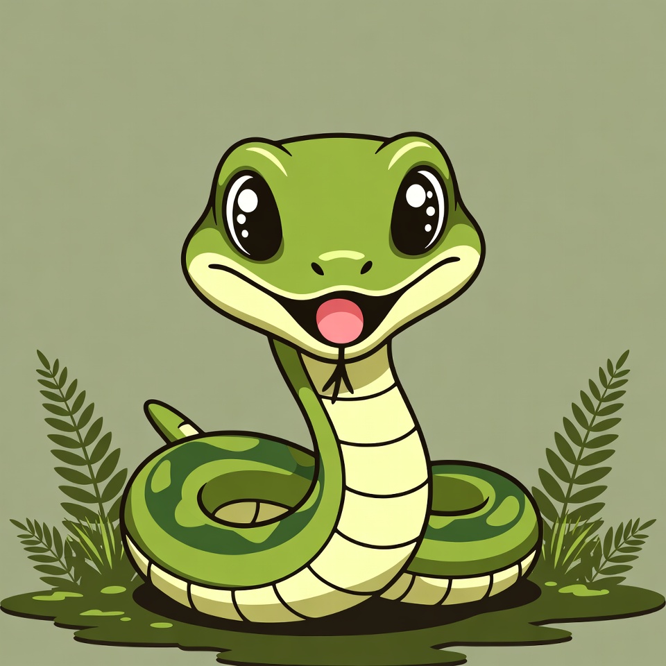 A kawaii-style cartoon snake with bright green scales and large sparkling eyes smiles happily with its tongue out. It coils on a light green background surrounded by ferns and grass. The illustration features a playful and adorable design.