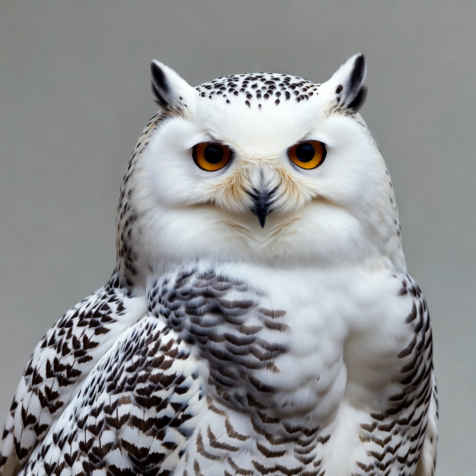 A snowy owl with white feathers speckled in black stares directly at the camera with bright orange eyes. Its detailed facial feathers and curved beak are prominently featured against a plain gray background. The owl's wings are slightly visible around its body.