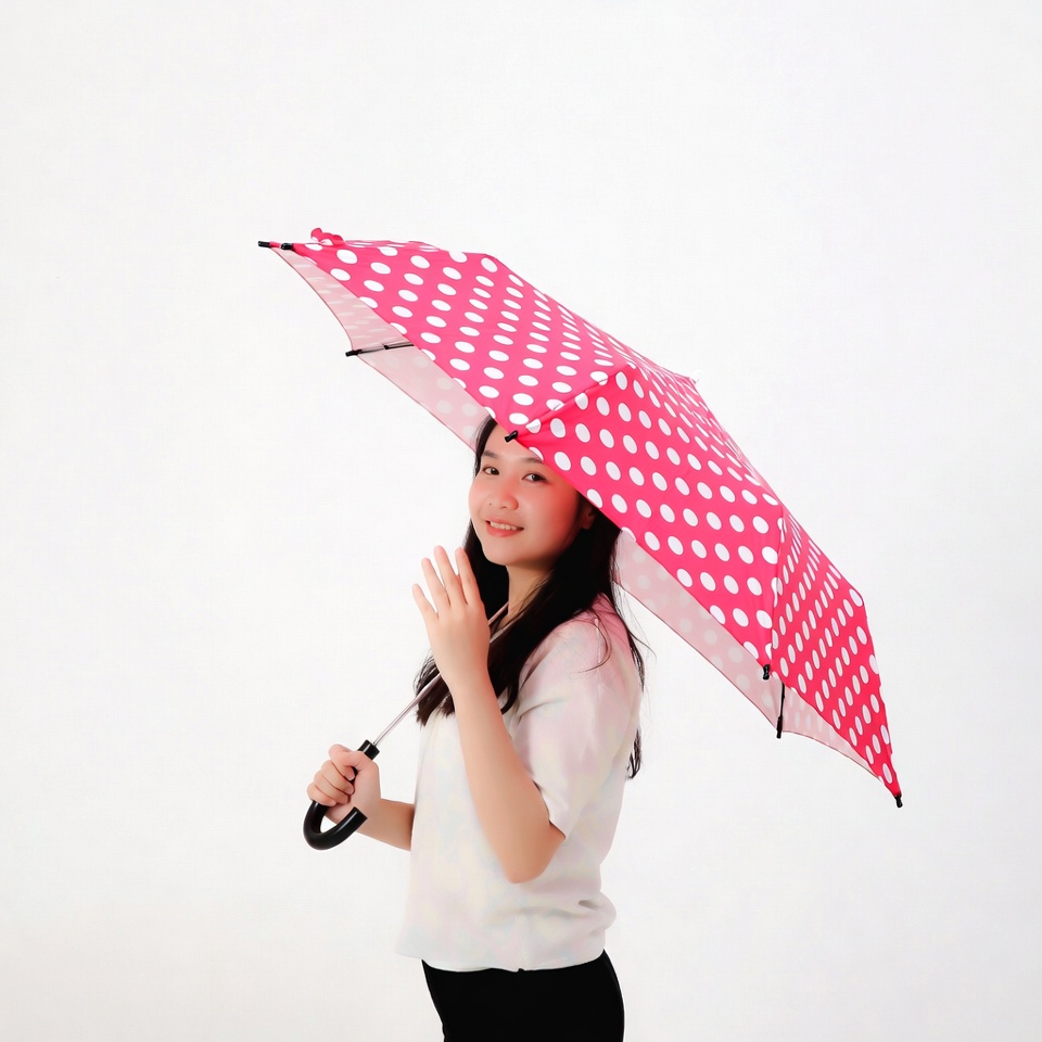 Asian, black pants, bright pink, cute girl, fashion, female, holding umbrella, isolated background, long hair, pink umbrella, polka dot umbrella, polka dots, smiling woman, studio photo, waving hand, white top, young woman, woman