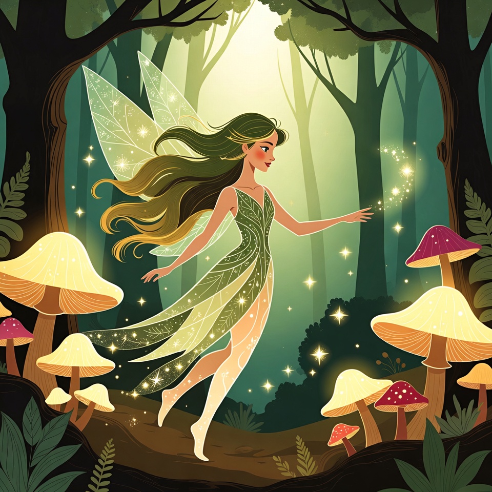 A beautiful fairy with long green hair and translucent wings flies gracefully in a lush forest framed by trees. She wears a flowing green dress adorned with leaves and casts sparkling magic from her hand. Colorful mushrooms in yellow and red dot the forest floor amid glowing lights and ferns.