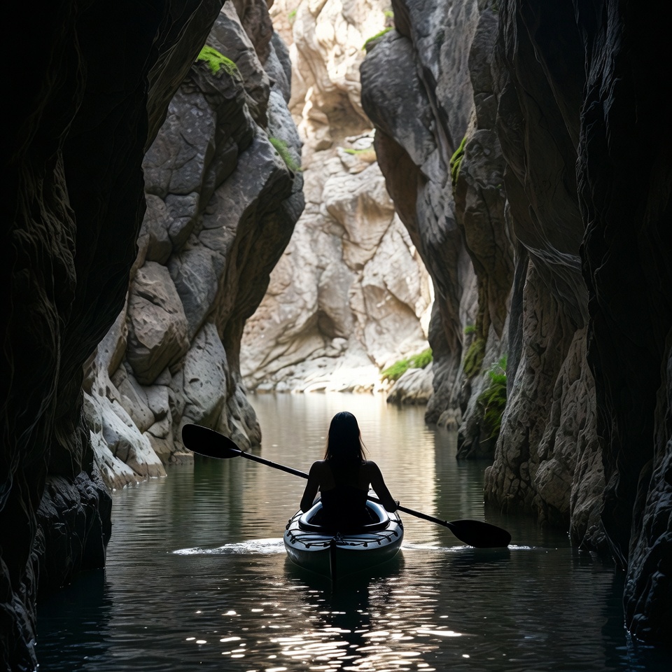 A woman with long hair paddles a kayak through a narrow rocky canyon with a calm river. The scene is captured in silhouette against the bright light at the canyon entrance, highlighting the tall stone walls and green moss patches. She holds a double-bladed paddle while centered in the turquoise kayak on the reflective water.