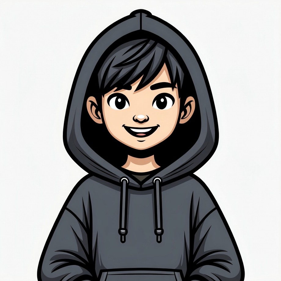 Asian, anime style, big eyes, black hair, black hoodie, boy, character design, clipart, cute boy, drawing, graphic, happy face, hood up, hoodie, illustration, isolated background, smiling boy, vector art, young boy, cartoon boy