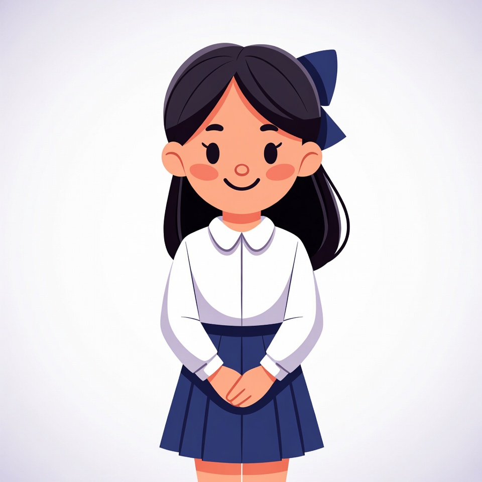 A cute cartoon Asian girl with long black hair and a large navy blue bow stands smiling on a white background. She wears a white collared shirt and navy blue pleated skirt with hands clasped in front. Her cheerful expression features rosy cheeks and big eyes.