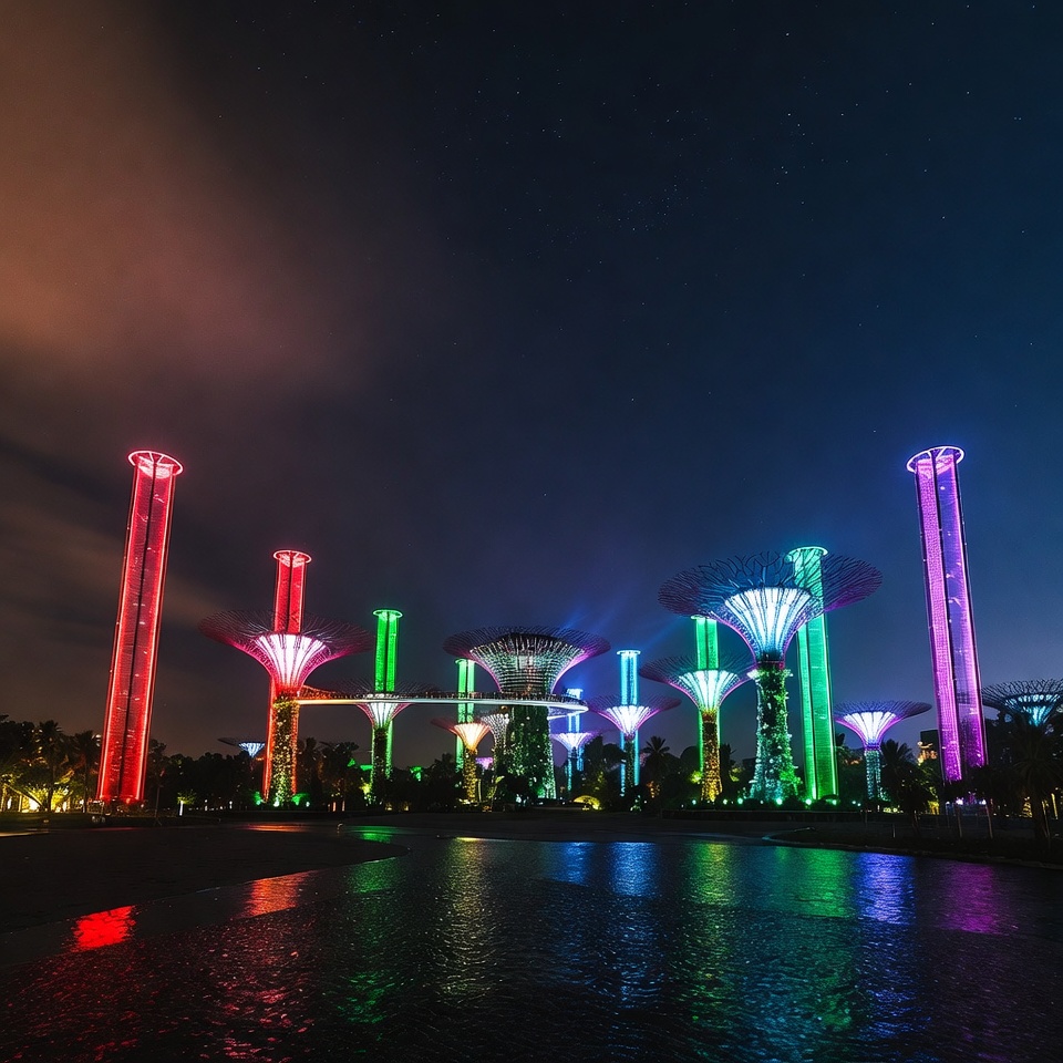 Singapore, Supertrees, architecture, blue lights, city lights, colorful lights, evening view, futuristic trees, garden, glowing structures, green lights, illuminated trees, landmark, neon glow, night, nightscape, palm trees, red lights, reflection, skyway bridge, tourism, travel, tropical garden, water, Gardens by the Bay