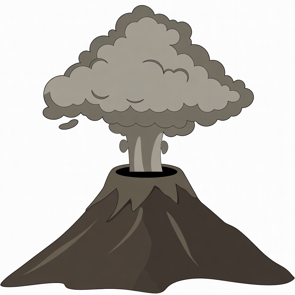 A cartoon volcano erupts with a large gray ash cloud billowing from its crater. The volcano has a dark brown conical shape with smooth slopes. It is depicted on an isolated white background.