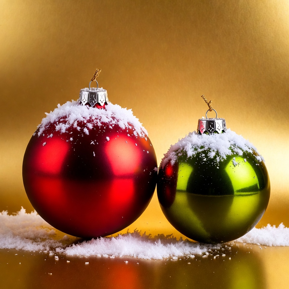 A large red Christmas bauble and a smaller green one sit side by side on a gold background. Both ornaments are covered in white snow and have shiny metallic finishes with hanging hooks. Snow dusts the base beneath them.
