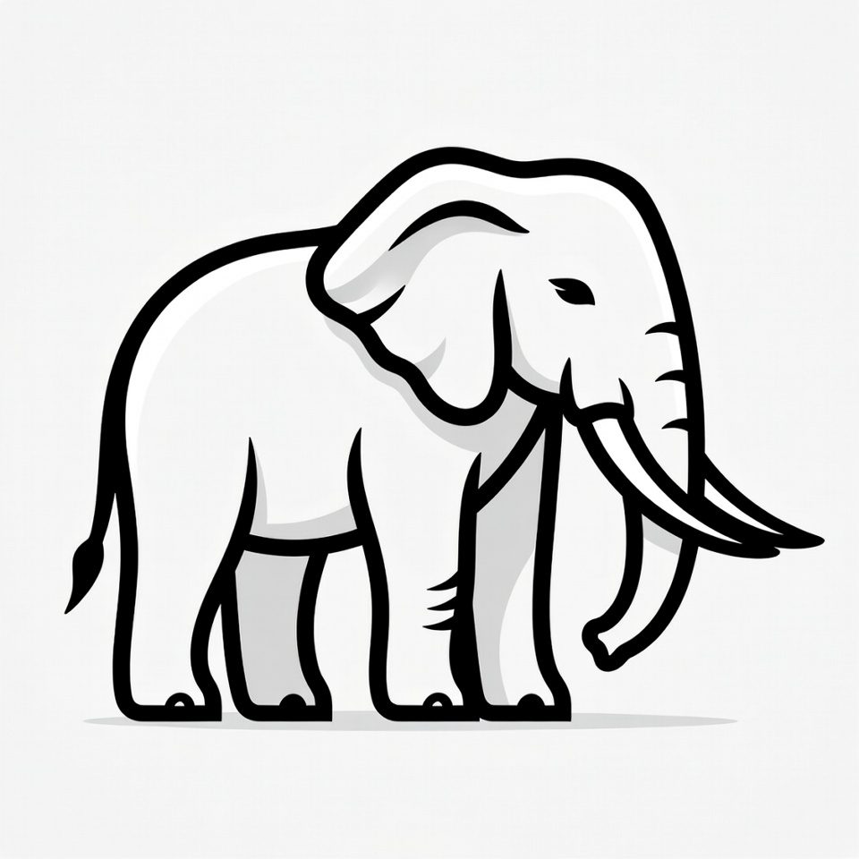 animal, black and white, cartoon elephant, clipart, cute elephant, elephant illustration, isolated background, large ears, line drawing, standing elephant, tail, trunk, tusks, vector art, elephant