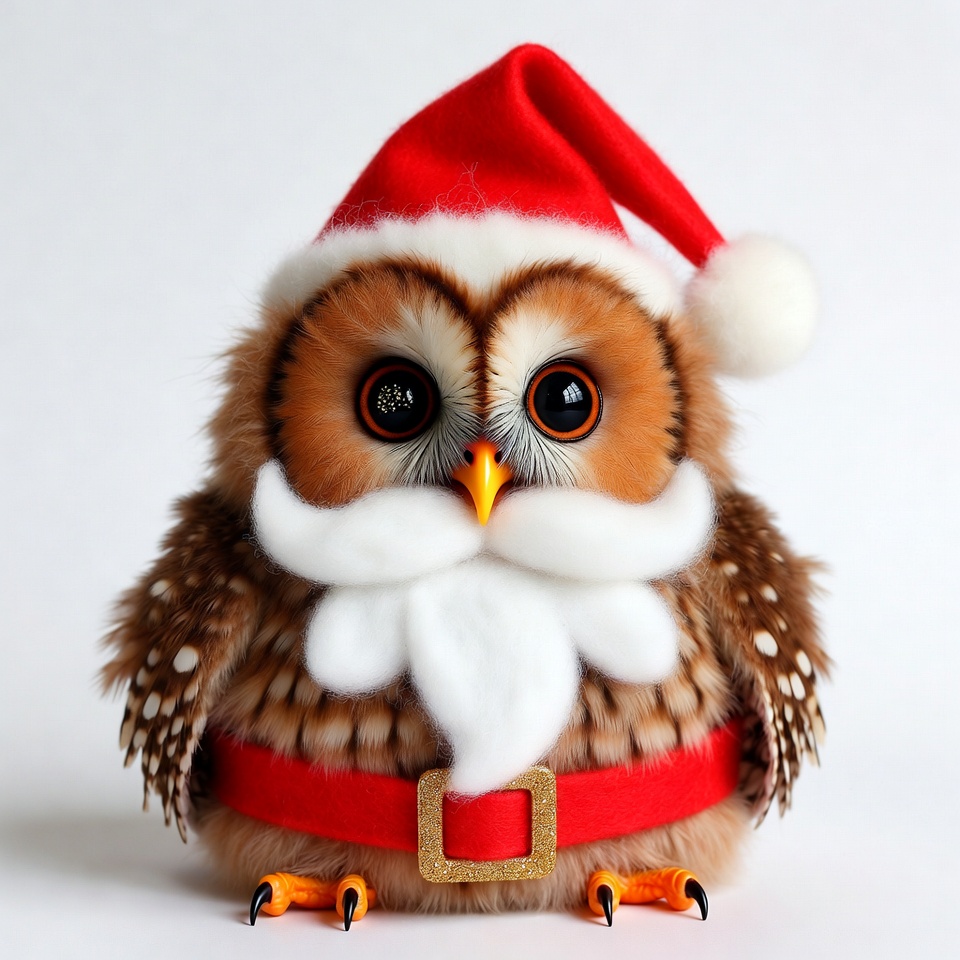 Christmas, Santa Claus, Santa costume, Santa hat, animal costume, brown owl, cute owl, festive animal, fluffy feathers, gold buckle, holiday owl, large eyes, orange eyes, plush toy, red hat, red jacket, spotted feathers, white background, white beard, owl