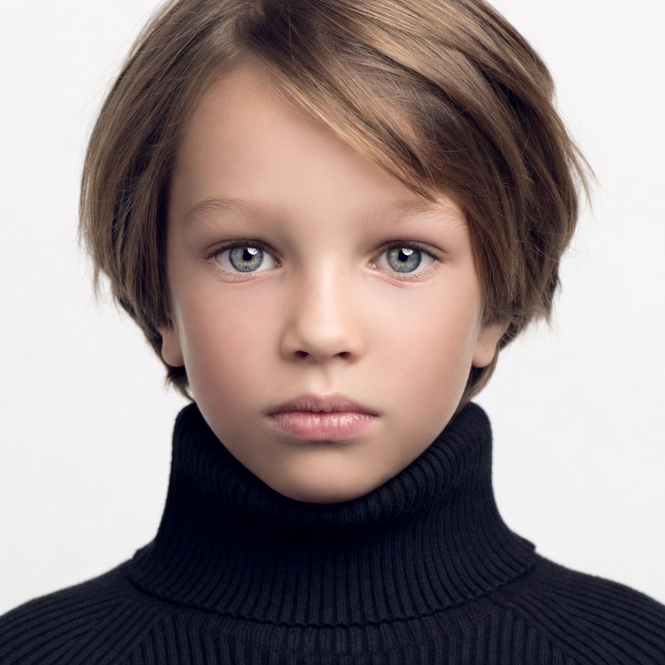 White, black turtleneck, blue eyes, child, headshot, isolated background, light brown hair, male, neutral expression, portrait, short hair, sweater, turtleneck sweater, white background, young boy, boy