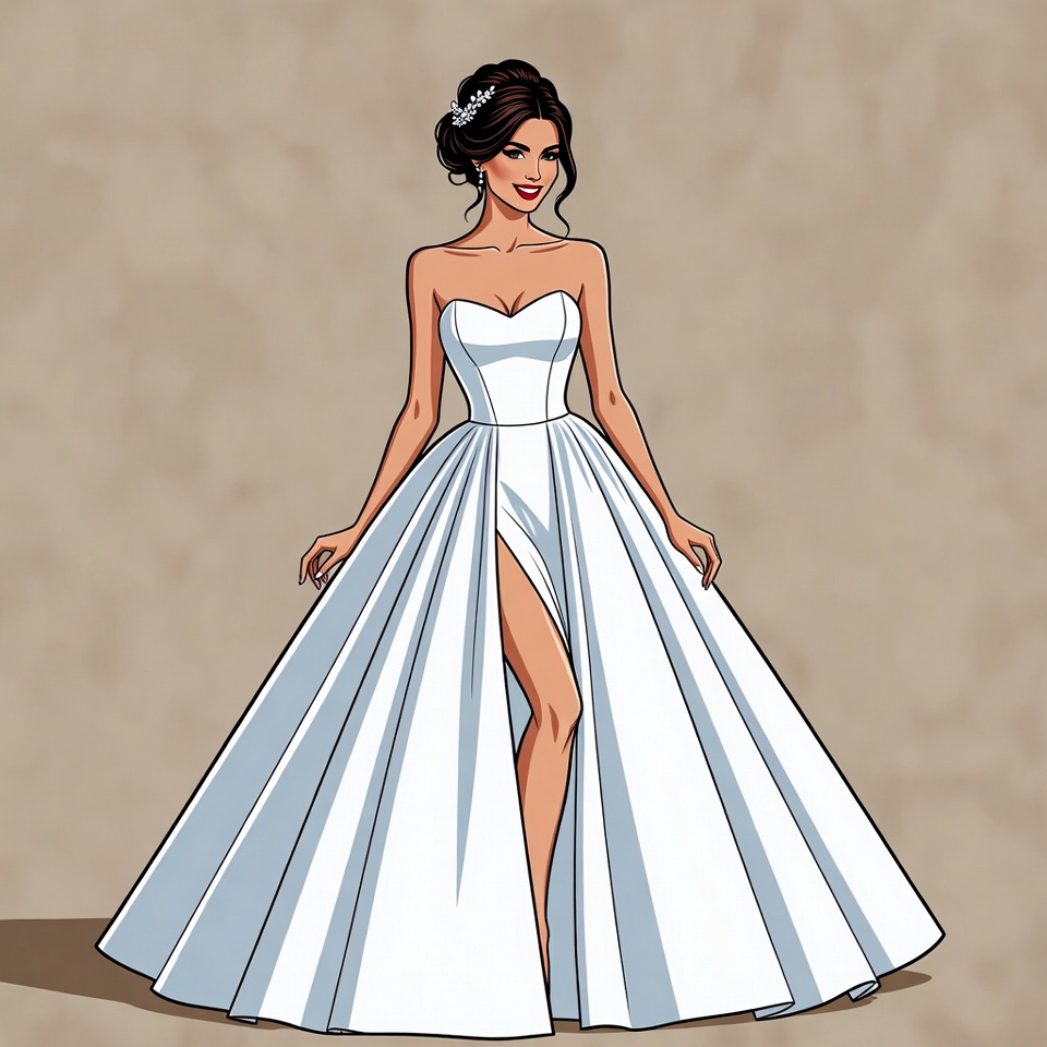 A brunette woman with an elegant updo hairstyle and sparkling earrings poses in a strapless white ball gown. The gown features a sweetheart neckline, fitted bodice, and a full skirt with a high side slit revealing her leg. She stands confidently against a beige background in a cartoon illustration style.