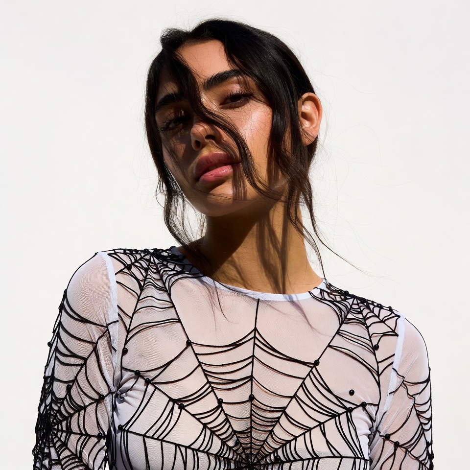 A young woman with long dark wavy hair tilts her head slightly against a white background. She wears a sheer white mesh top intricately designed with black spiderweb patterns. Her face features full lips and subtle makeup, with hair partially covering one eye.