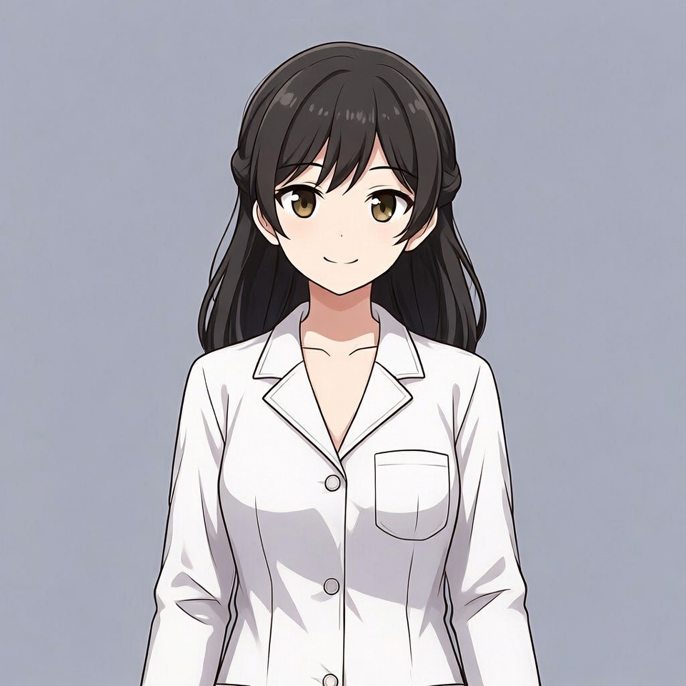 An anime girl with long dark brown hair styled in a low ponytail smiles warmly against a plain gray background. She wears a white lab coat with a deep V-neckline over a white top. Her large golden eyes and cheerful expression are prominent in the illustration.