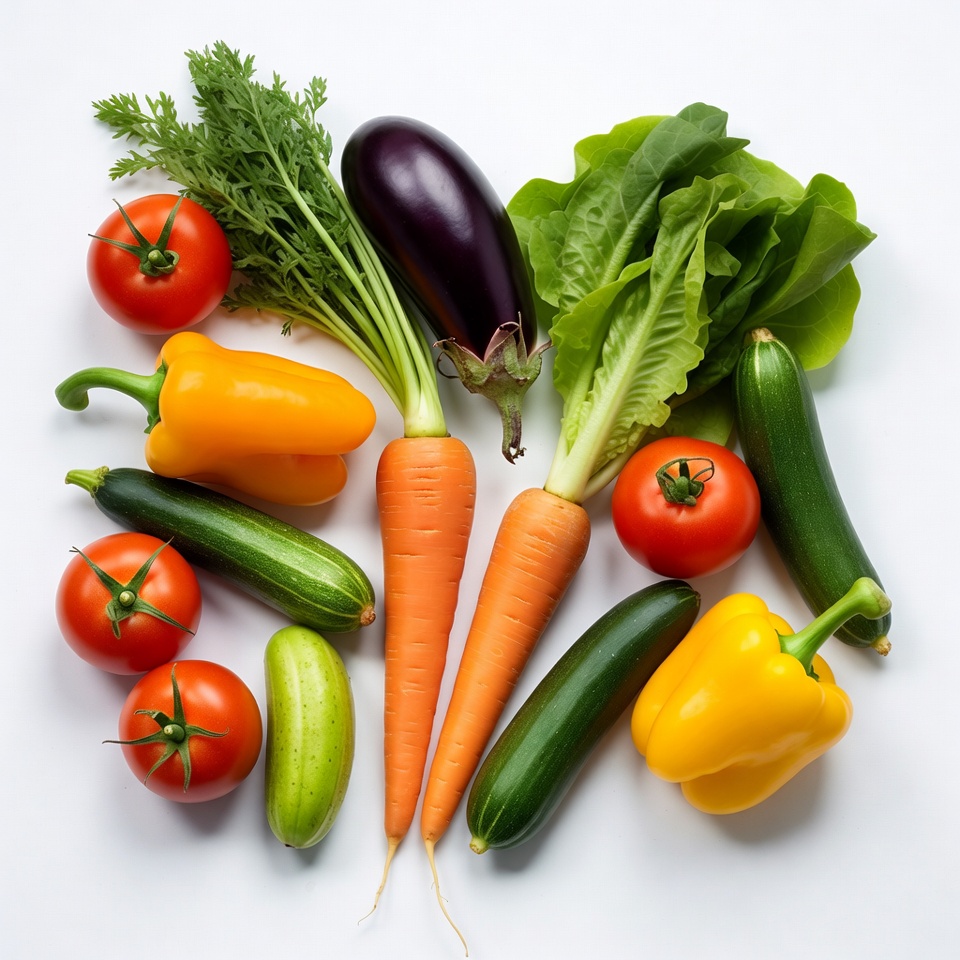 bell peppers, carrots, eggplants, food photography, fresh vegetables, green zucchini, healthy food, herbs, isolated vegetables, lettuce, orange carrots, produce, purple eggplant, red tomatoes, tomatoes, veggie arrangement, white background, yellow peppers, zucchini, vegetables