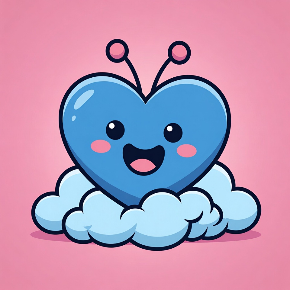A kawaii blue heart-shaped character with antennae, big sparkling eyes, and a wide smile sits atop fluffy white clouds. It features pink blushing cheeks and rosy antenna tips against a solid pink background. The illustration has a playful, cartoonish style.