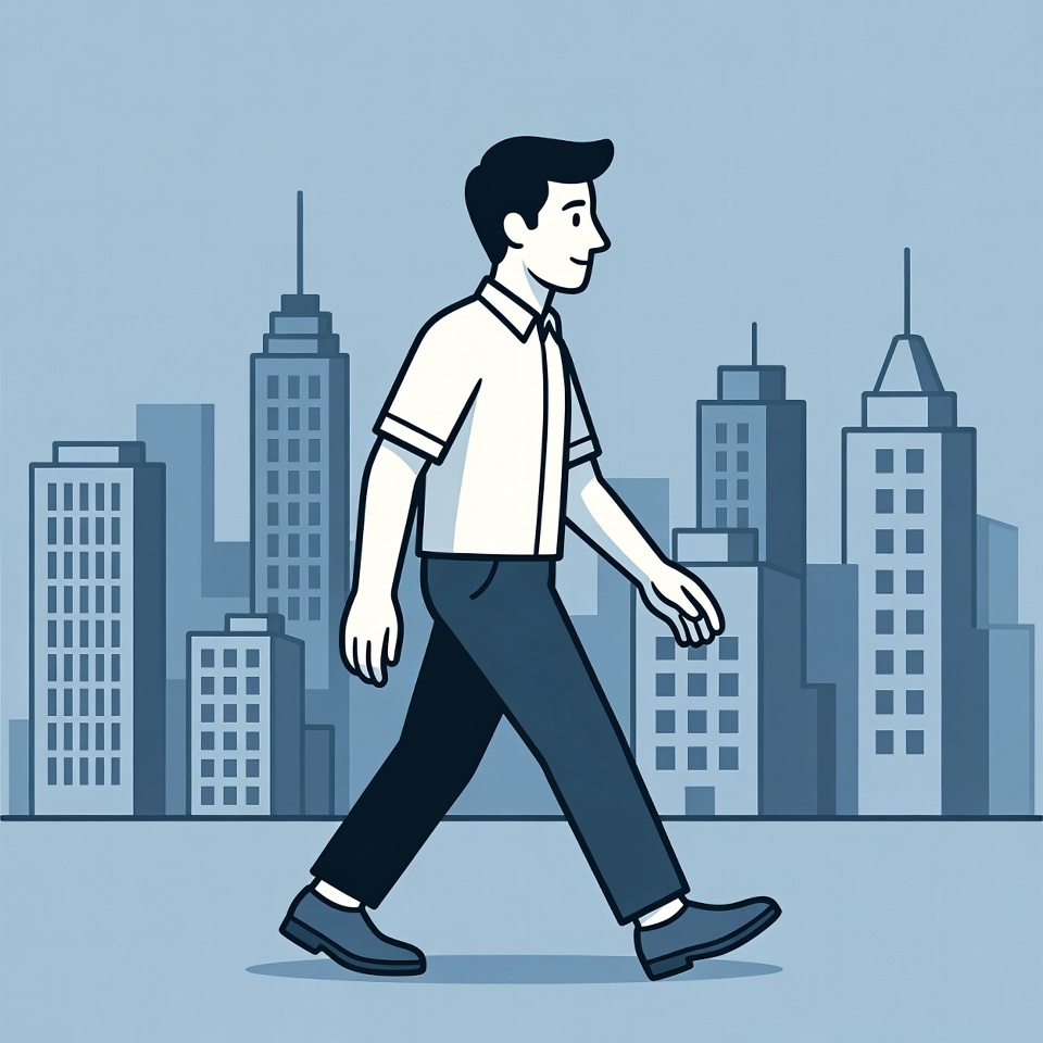 A cartoon illustration depicts a smiling man with short dark hair walking forward. He wears a white short-sleeve shirt, dark pants, and dress shoes. Tall skyscrapers line the background against a light blue sky.