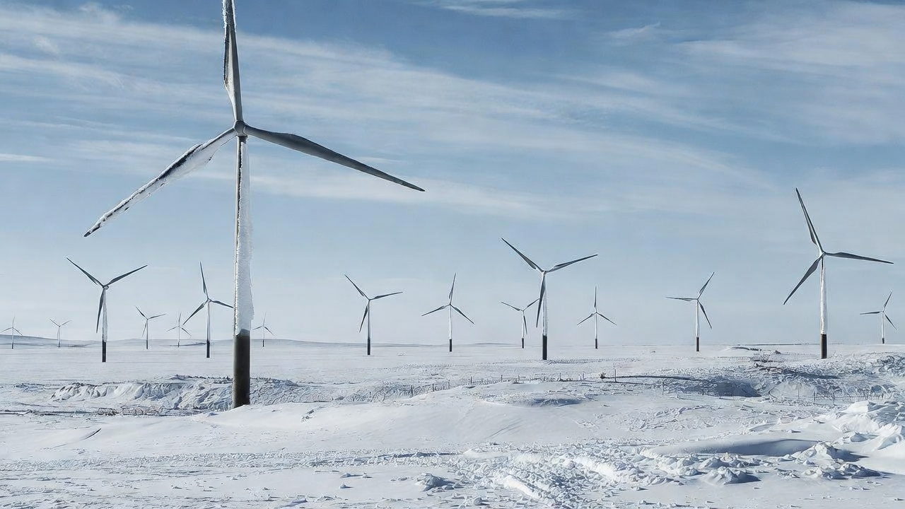 Multiple tall wind turbines with blades covered in snow stand in a vast snowy field under a clear blue sky. The turbines are arranged in rows across the frozen landscape. Snow dusts the ground and turbine bases.