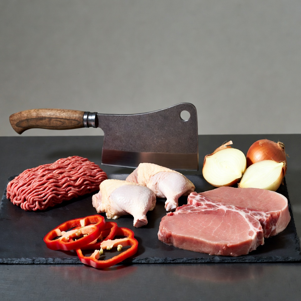 bell peppers, butcher knife, chicken drumstick, chicken legs, cleaver knife, cooking ingredients, cutting board, food ingredients, fresh ingredients, ground beef, meat cleaver, onions, peppers, pork chop, raw beef, raw chicken, raw pork, red peppers, slate board, sliced onions, wooden handle, raw meat