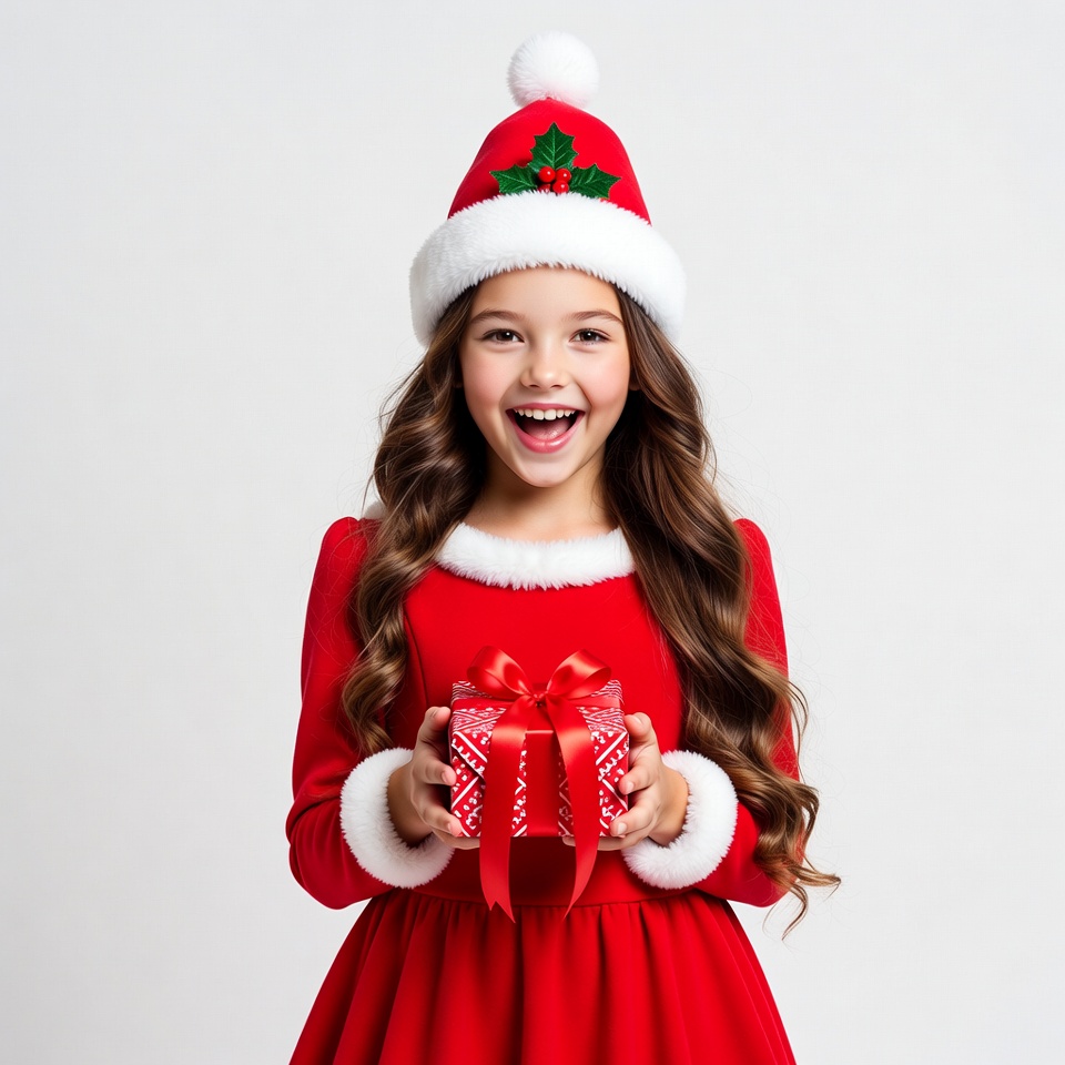 A young girl with long wavy brown hair smiles happily while holding a red gift box with a bow. She wears a festive red Santa dress with white fur trim and a matching Santa hat decorated with holly. She stands against a plain white background.