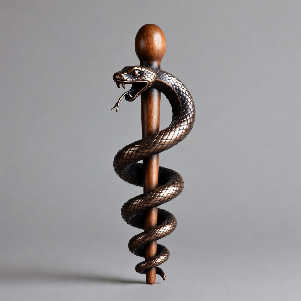 A detailed bronze snake coils around a smooth wooden staff, forming the Rod of Asclepius symbol. The snake's head is positioned at the top with an open mouth and extended tongue. A round wooden knob tops the staff against a plain gray background.