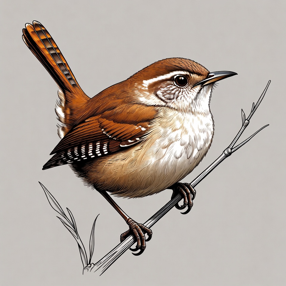 animal, avian, beak, bird, branch, brown bird, cinnamon teal, claws, detailed drawing, feathers, illustration, isolated background, long tail, nature, perched, small bird, white streaks, wildlife, wren