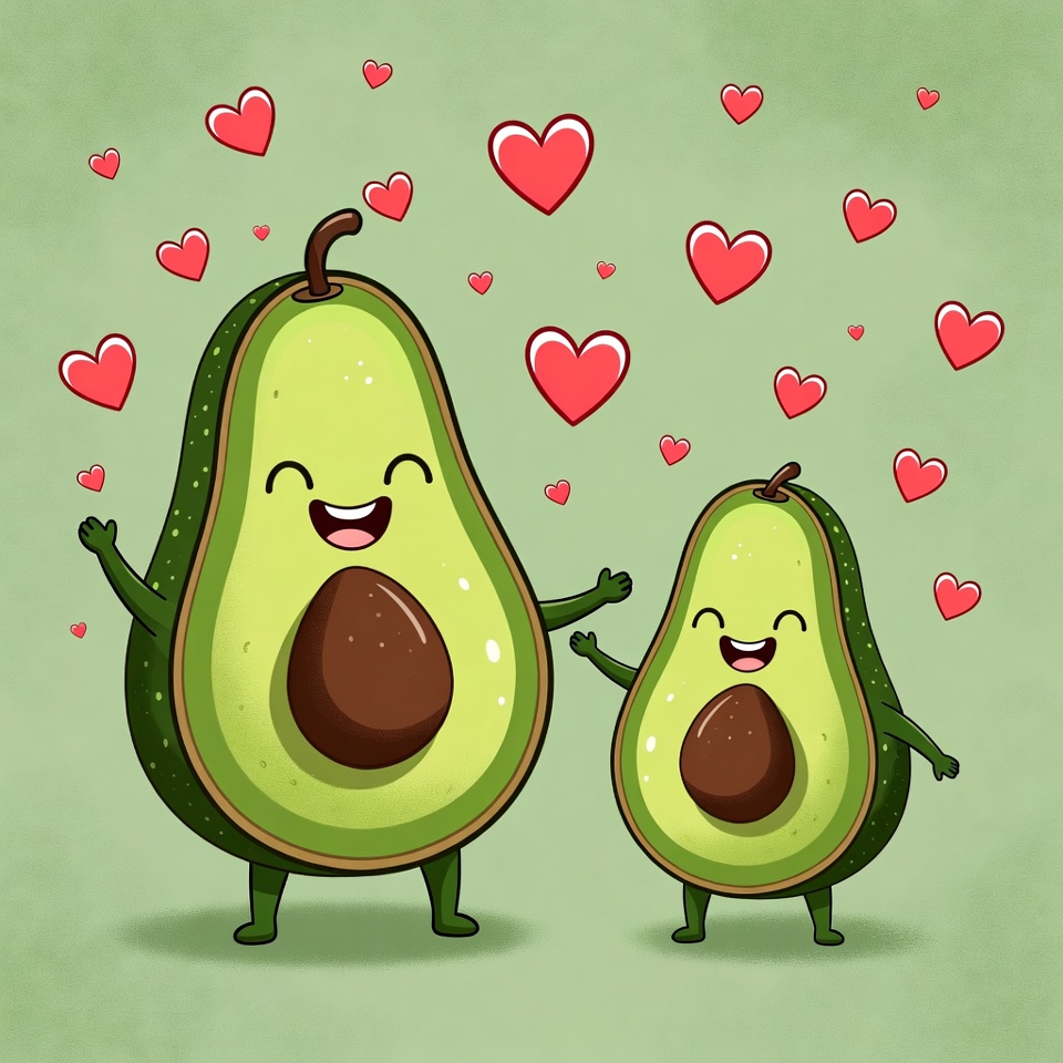 A large smiling avocado and a small baby avocado stand together on a light green background, both with arms outstretched happily. Bright red hearts float around them. The avocados have glossy green skin, large eyes, and cheerful smiles.