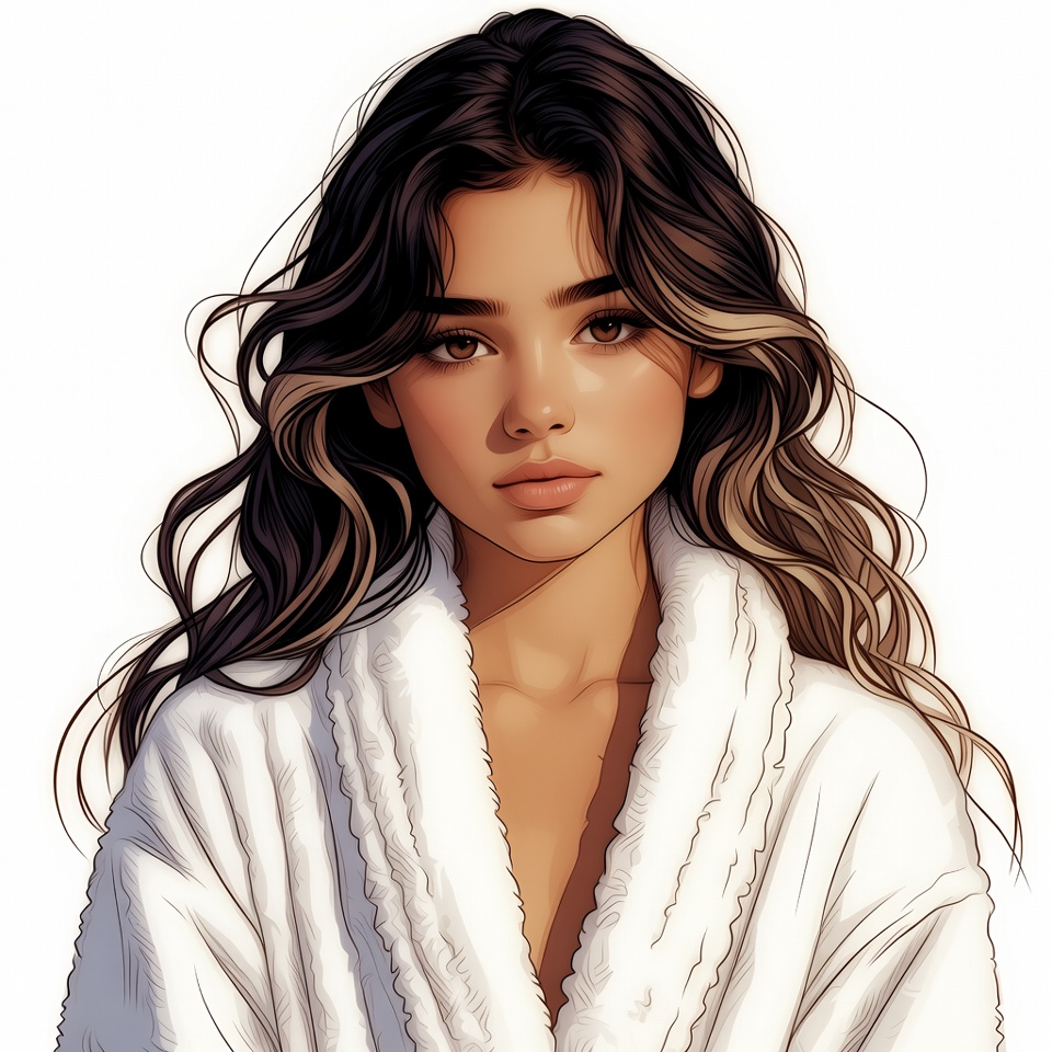A young woman with long wavy brown hair highlighted with blonde streaks gazes forward. She wears a fluffy white bathrobe slightly open at the chest. The digital illustration features her on an isolated white background.