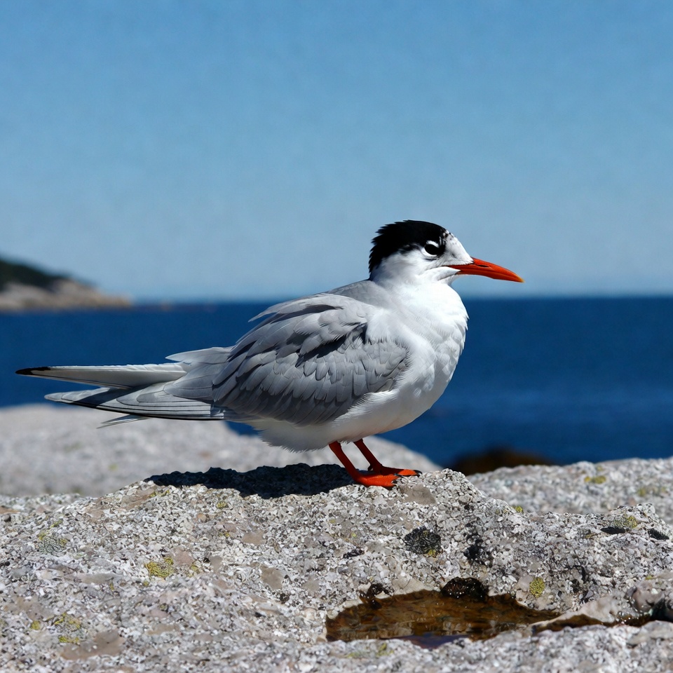 beach rocks, bird, black cap, blue sky, coast, nature, ocean, red beak, red legs, rocks, rocky shore, sea, shorebird, standing bird, water bird, white bird, wildlife, gull