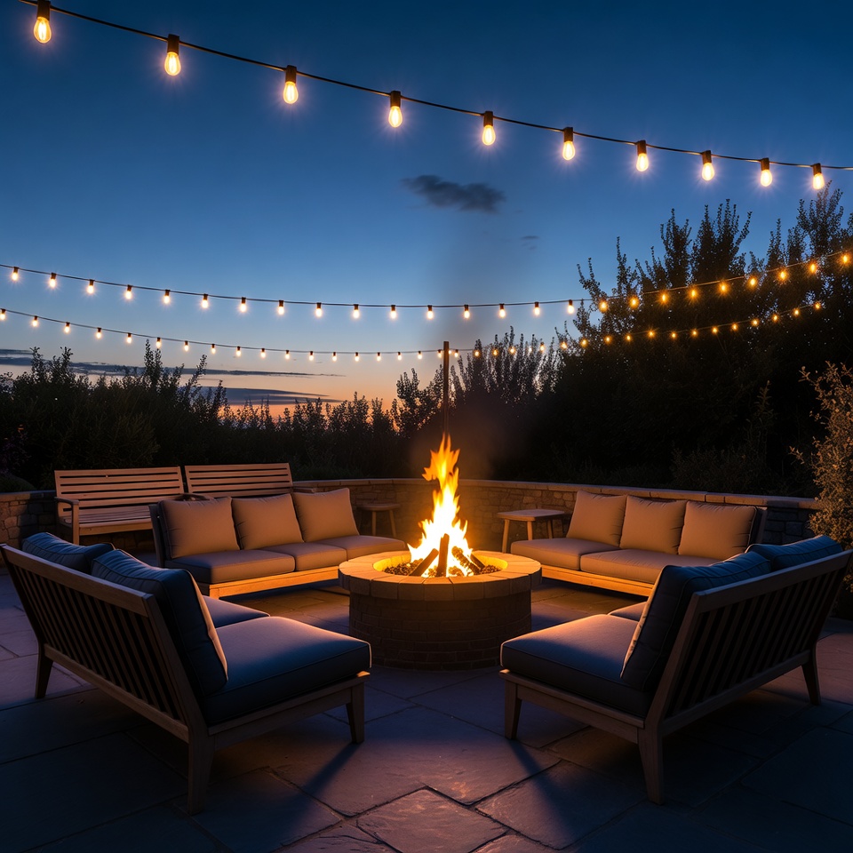 backyard, benches, chairs, cozy, cushions, dusk, evening, fire, fire burning, flames, garden, greenery, hanging lights, landscape, night, outdoor furniture, outdoor seating, patio, seating area, stone patio, string lights, trees, twilight, warm lights, fire pit
