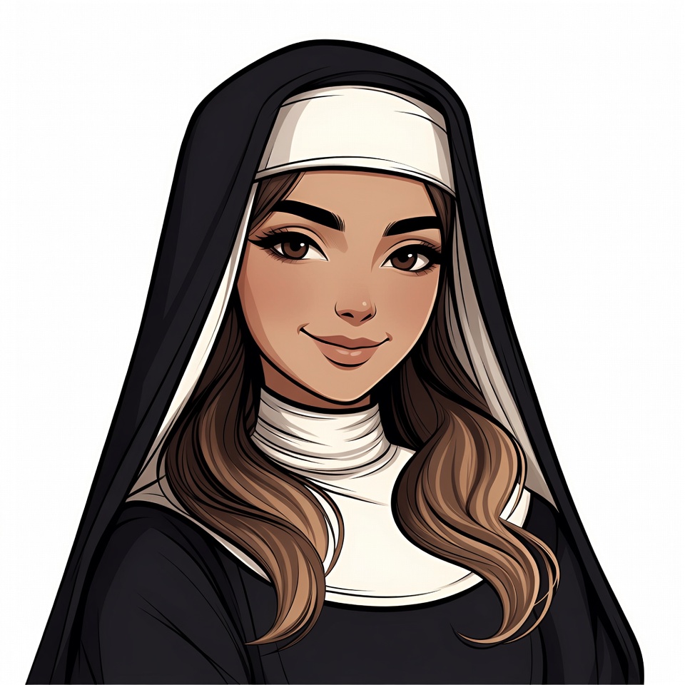 Middle Eastern, anime style, beautiful, black habit, brown eyes, brown hair, cartoon, clipart, female, gentle smile, habit, illustration, isolated background, portrait, religious, smiling nun, tan skin, white wimple, wimple, woman, young woman, nun