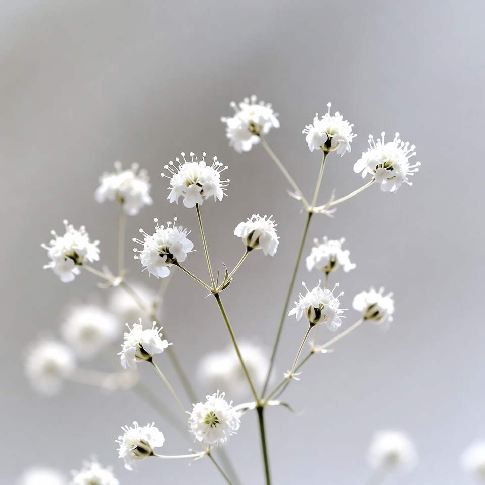 A cluster of delicate white baby's breath flowers with tiny blooms on thin green stems. The flowers are arranged closely together against a soft gray background. Each flower head features numerous small white florets.