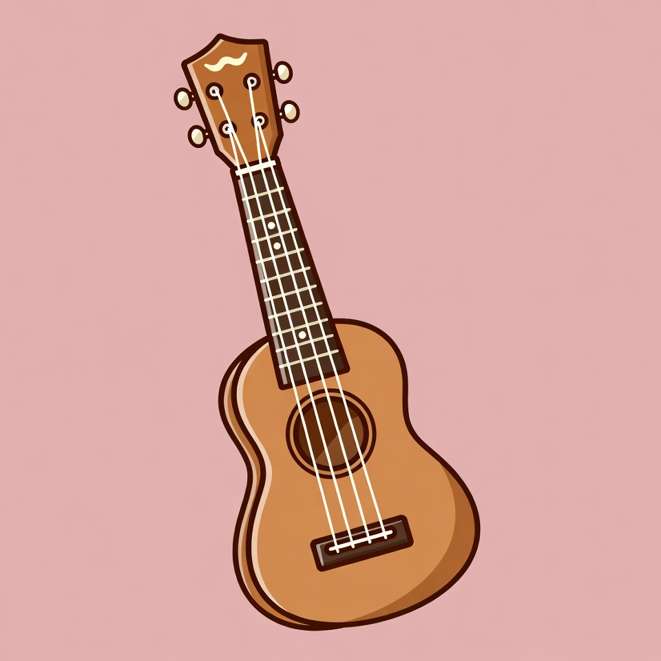 brown ukulele, cartoon ukulele, clipart, cute ukulele, drawing, illustration, isolated background, musical instrument, pink background, sound hole, strings, tuning pegs, ukulele illustration, vector, ukulele