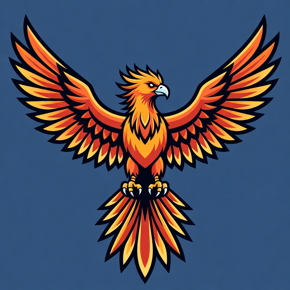 beak, bird, bold lines, clipart, crest, dark blue background, fantasy bird, feathers, fiery phoenix, flames, flying phoenix, illustration, isolated background, mythical bird, orange phoenix, phoenix emblem, talons, vector art, wings spread, phoenix