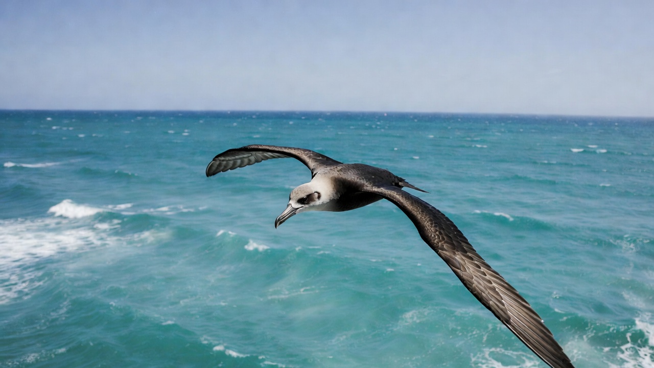 bird in flight, black-browed albatross, blue sky, dark feathers, flying bird, marine bird, ocean, sea, seabird, soaring bird, turquoise water, waves, white face, wildlife, yellow eye ring, albatross