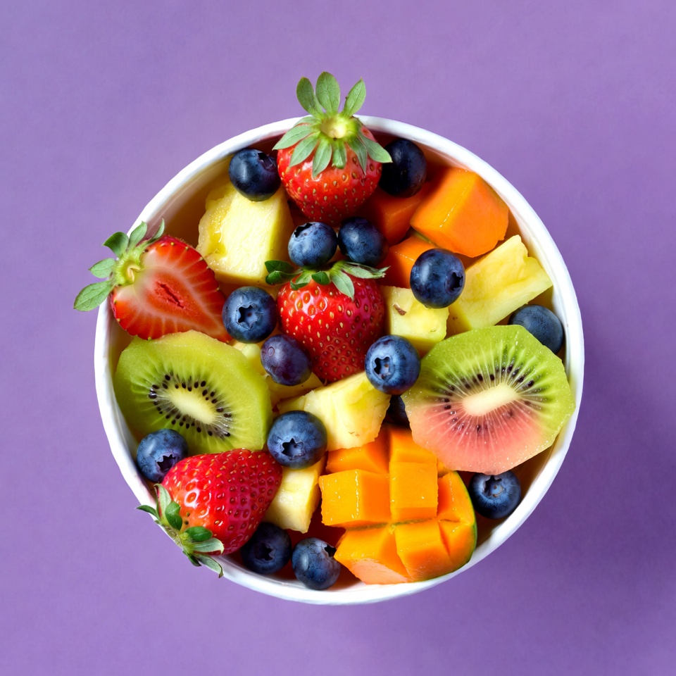 blueberries, cantaloupe, colorful fruits, food photography, fresh fruit, fruit salad, healthy food, kiwi fruit, mango slices, mixed fruits, pineapple chunks, purple background, sliced fruits, strawberries, top view, vibrant colors, white bowl, fruit bowl