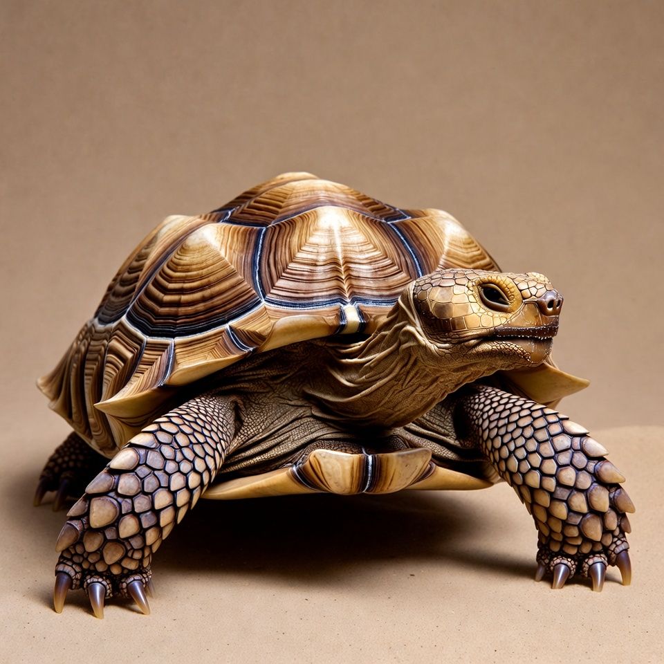 A detailed radiated tortoise with intricate brown and yellow shell patterns stands on a textured brown surface. Its head is raised, showing golden eyes and textured skin. The legs are sturdy with scaly features extended forward.