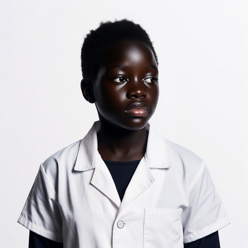 A young African boy with short curly black hair stands against a white background wearing a white lab coat over a dark shirt. He faces slightly to the side with a neutral expression. The lab coat features a collar, buttons, and pockets.