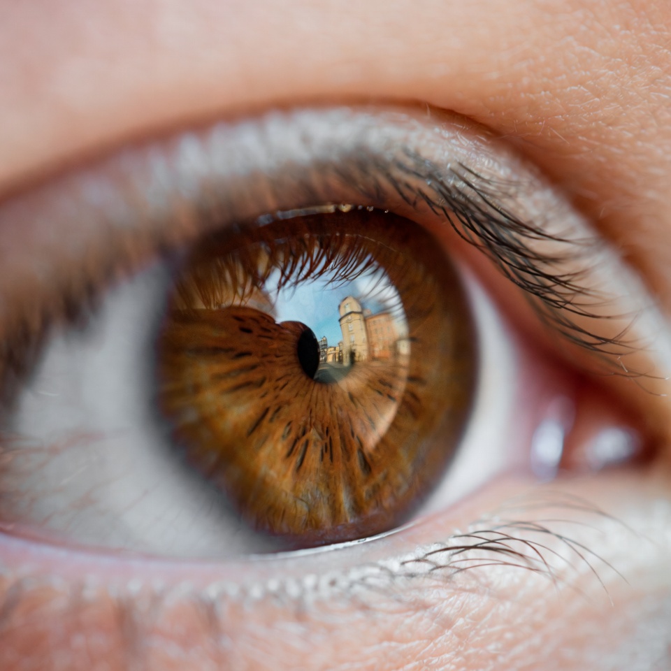 White, architecture, brown eye, building reflection, close-up, eye reflection, eyelashes, female, human eye, iris, macro photography, pupil, reflection, stone building, tall building, tower, eye