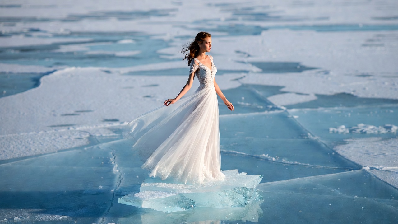 A woman with long wavy brown hair stands gracefully on a frozen icy surface. She wears an elegant off-shoulder white wedding gown with a flowing skirt. Her pose is dynamic with one arm extended and the dress billowing in the wind.