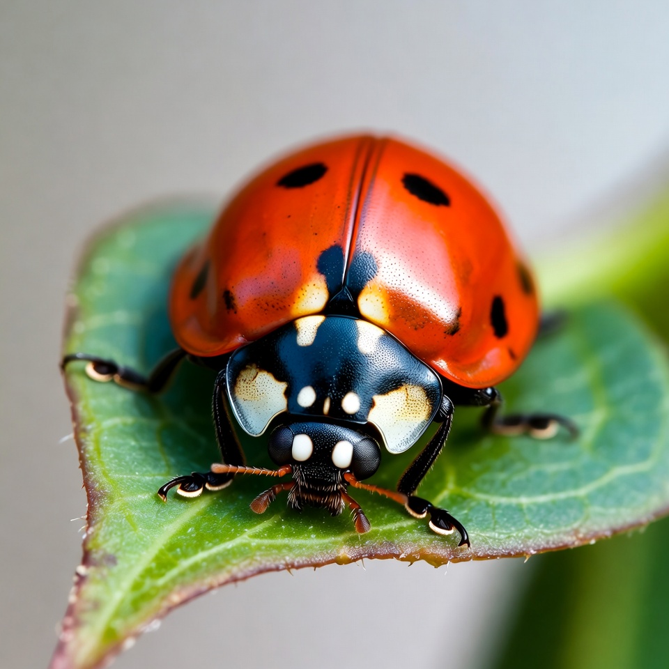 A close-up view of a red ladybug with black spots perched on a fresh green leaf. The ladybug faces forward, showcasing its shiny black head and white markings. Its legs grip the leaf's edge against a blurred background.