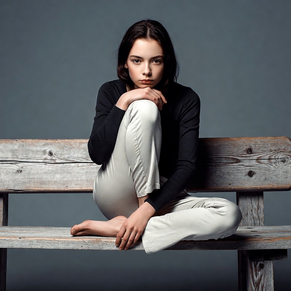 A young woman with long dark hair sits cross-legged on a weathered wooden bench. She wears a black long-sleeve sweater and light-colored flared pants, with bare feet. Her arms are crossed, and she gazes thoughtfully against a gray background.