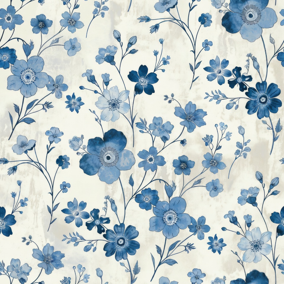 A seamless pattern features clusters of delicate blue flowers with stems and leaves scattered across a textured, distressed white background. The flowers have soft petals and prominent centers in varying shades of blue. The design repeats continuously for use as wallpaper or fabric.