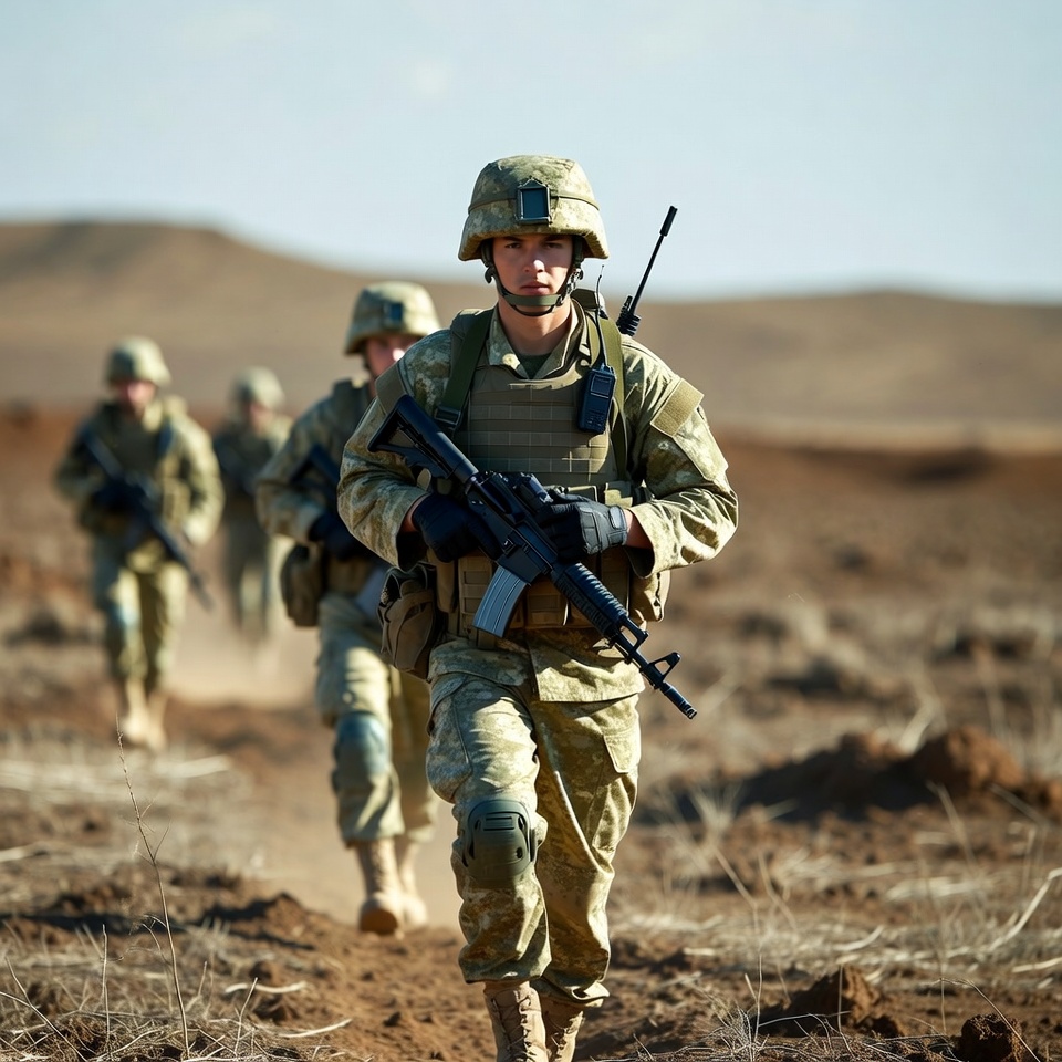 Soldiers marching in desert terrain
