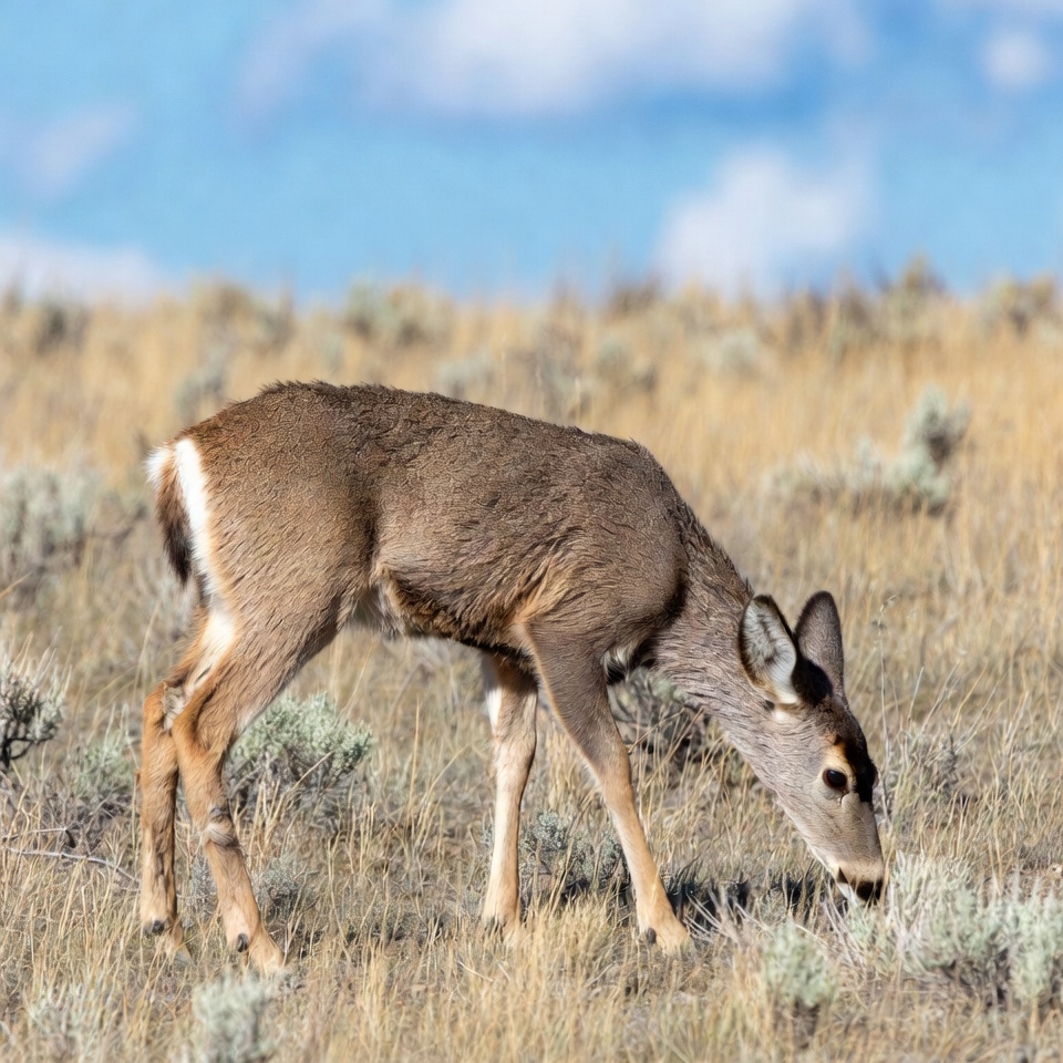animal, blue sky, brown fur, clouds, deer fawn, dry grassland, field, grass, grazing deer, isolated background, large ears, nature, outdoors, sagebrush, white rump, wildlife, young deer, mule deer