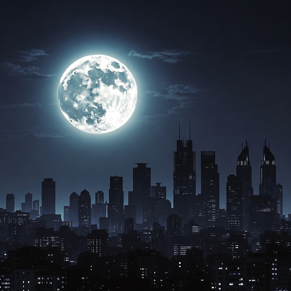 city skyline, clouds, dark night, glowing moon, high-rise buildings, moon, night sky, silhouette, skyscrapers, urban landscape, full moon