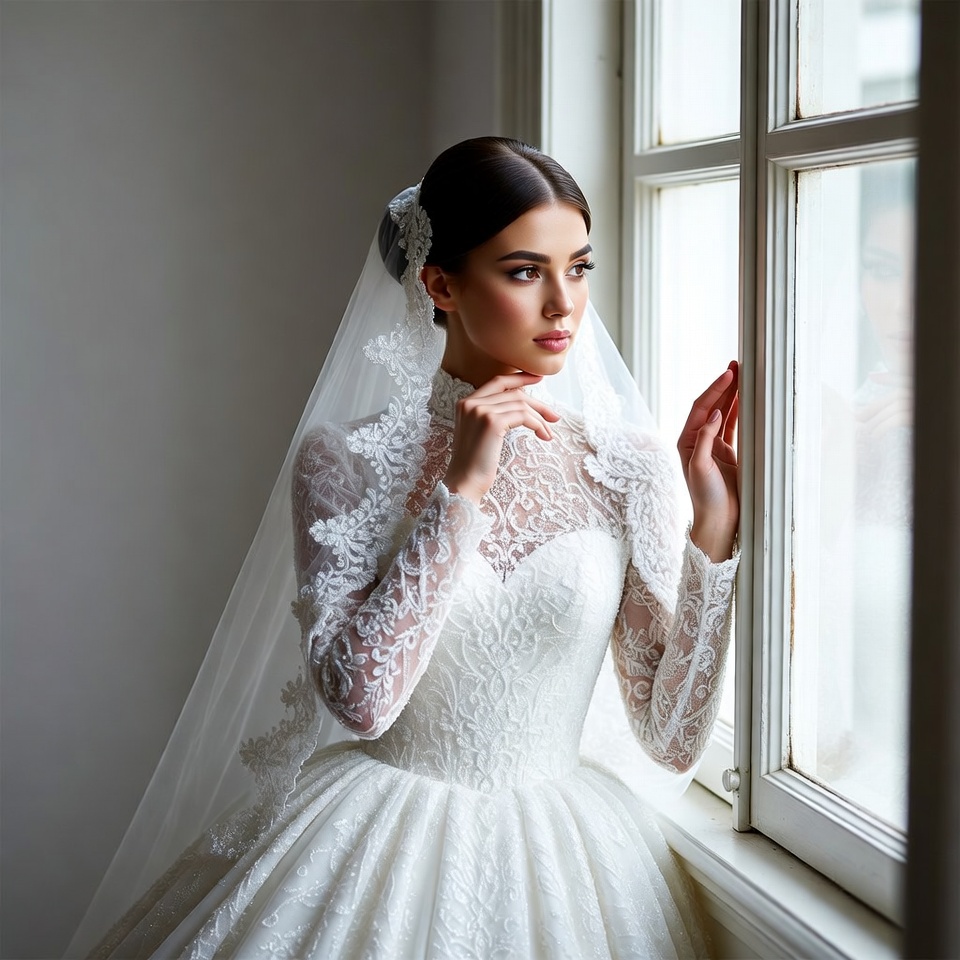 White, bridal, dark hair, elegant, female, full skirt, gazing, indoor, lace dress, long sleeves, marriage, portrait, thoughtful pose, updo, veil, wedding dress, white gown, window, woman, bride