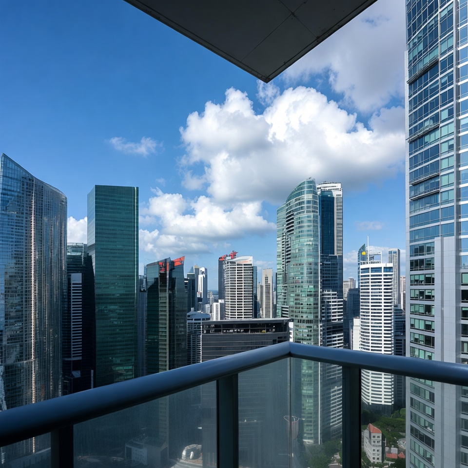 Singapore city, aerial perspective, balcony view, blue sky, city view, cityscape, cloudy sky, contemporary buildings, downtown skyline, glass buildings, glass railing, high balcony, high-rise buildings, metropolis, modern architecture, skyscrapers, tall towers, urban landscape, white clouds, Singapore skyline