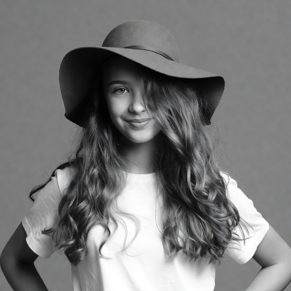 White, black and white, felt hat, female, floppy hat, hands on hips, isolated background, long hair, monochrome, portrait, smiling, wavy hair, white t-shirt, wide-brim hat, young girl, girl
