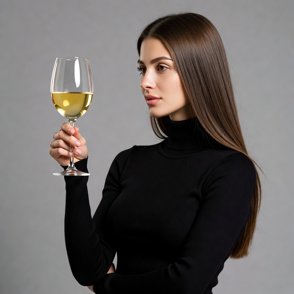 A woman with long straight brown hair holds a tall glass of white wine in her hand. She wears a fitted black turtleneck sweater and gazes sideways with a subtle expression. The background is plain gray.