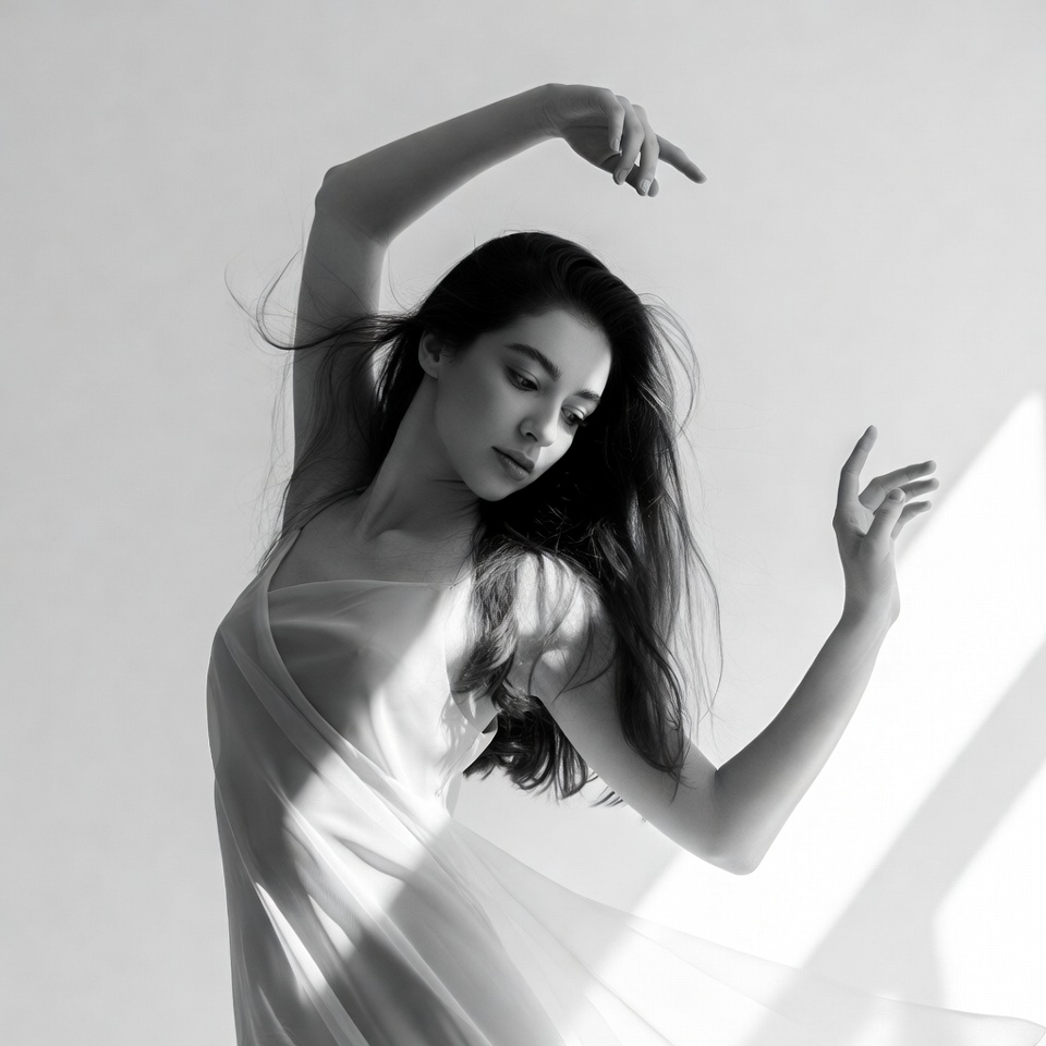 arched back, arms extended, artistic, ballet, black and white, dance pose, dancer, dark hair, elegant, female, flowing dress, graceful pose, isolated background, long hair, monochrome, slim figure, studio photo, white dress, young woman, woman