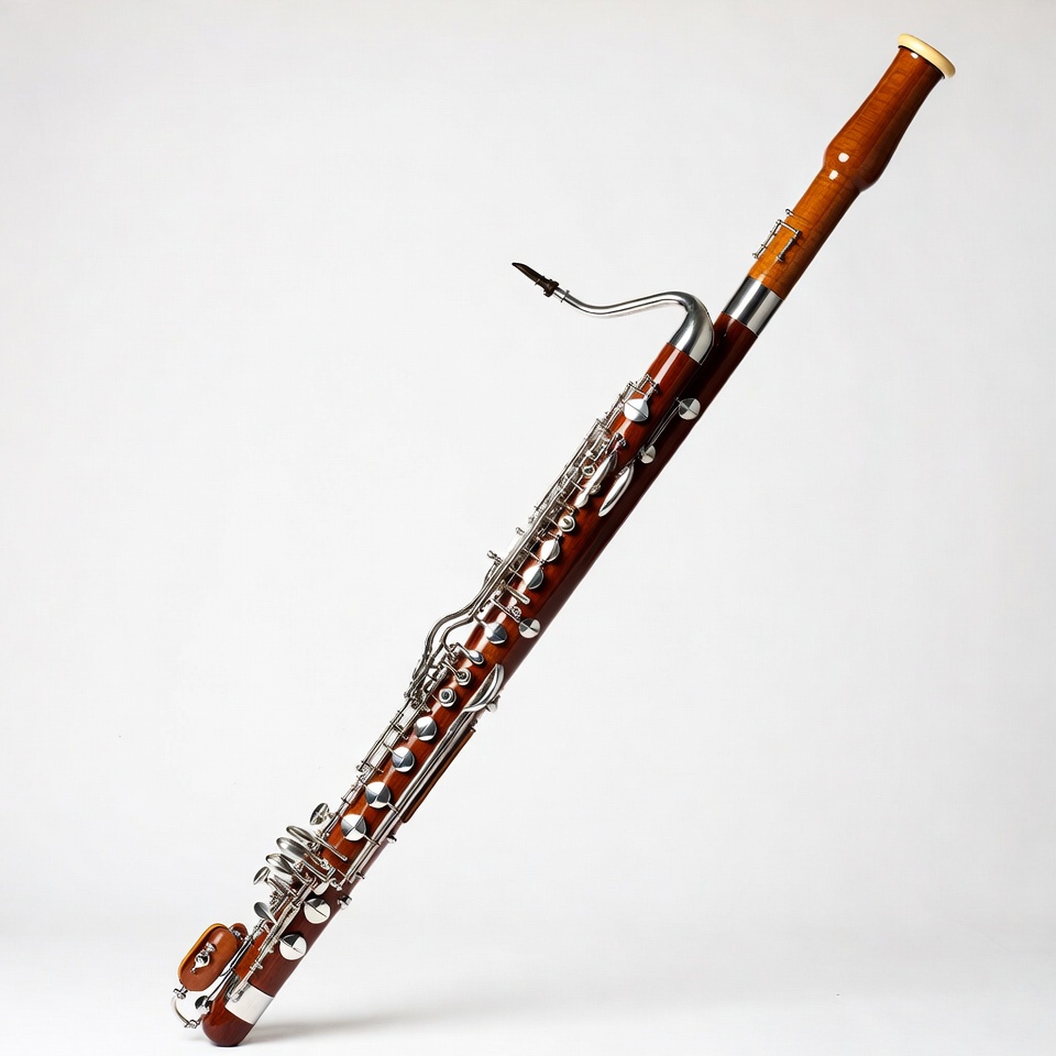 A wooden bassoon with a curved metal crook and reed is angled diagonally against a plain white background. The instrument features a reddish-brown wood body with numerous silver keys and ornate fittings. The long, slender design highlights its double reed mouthpiece and ergonomic shape.